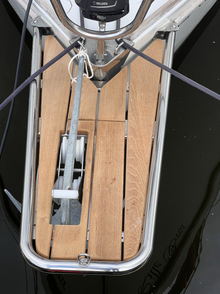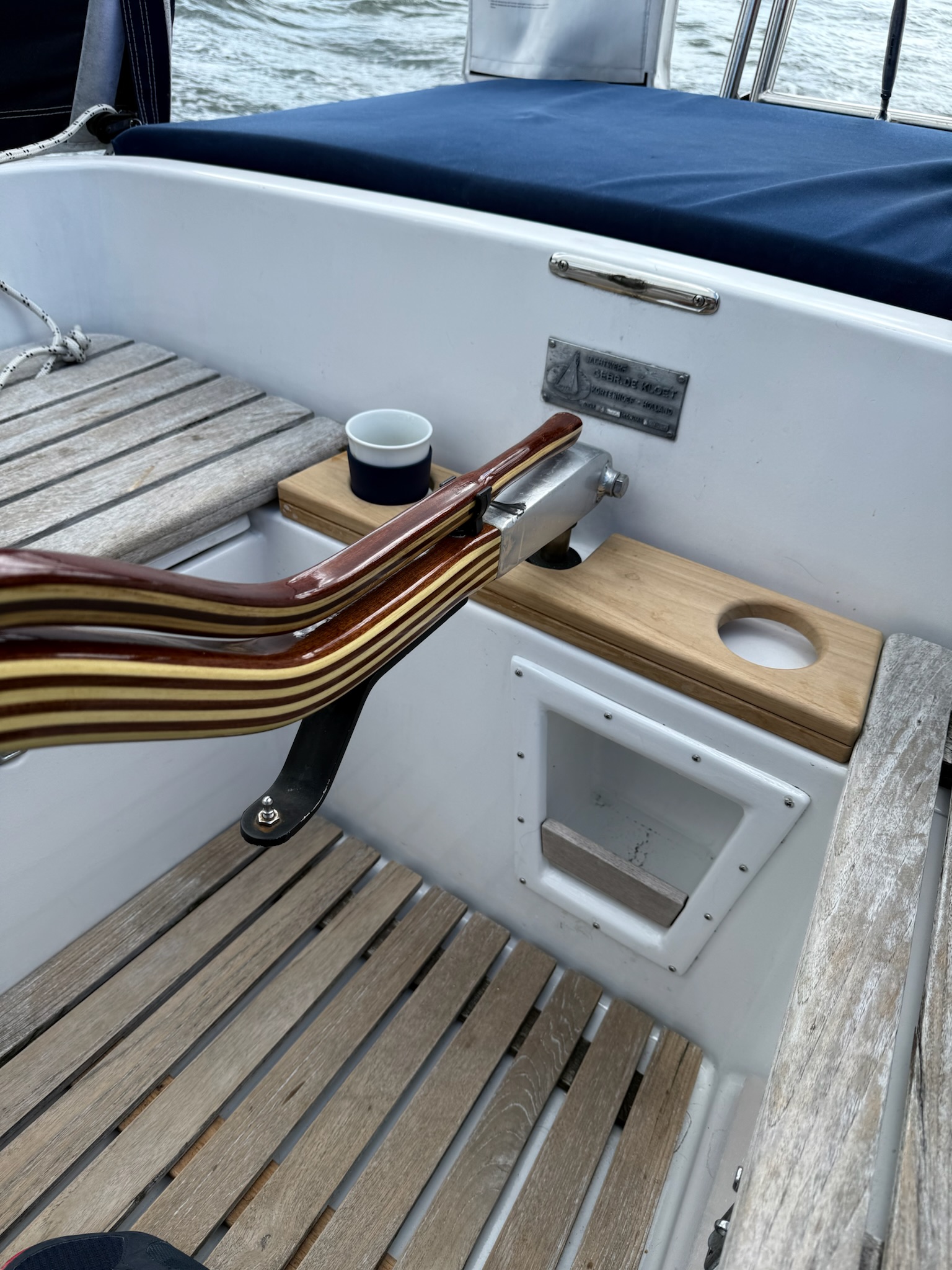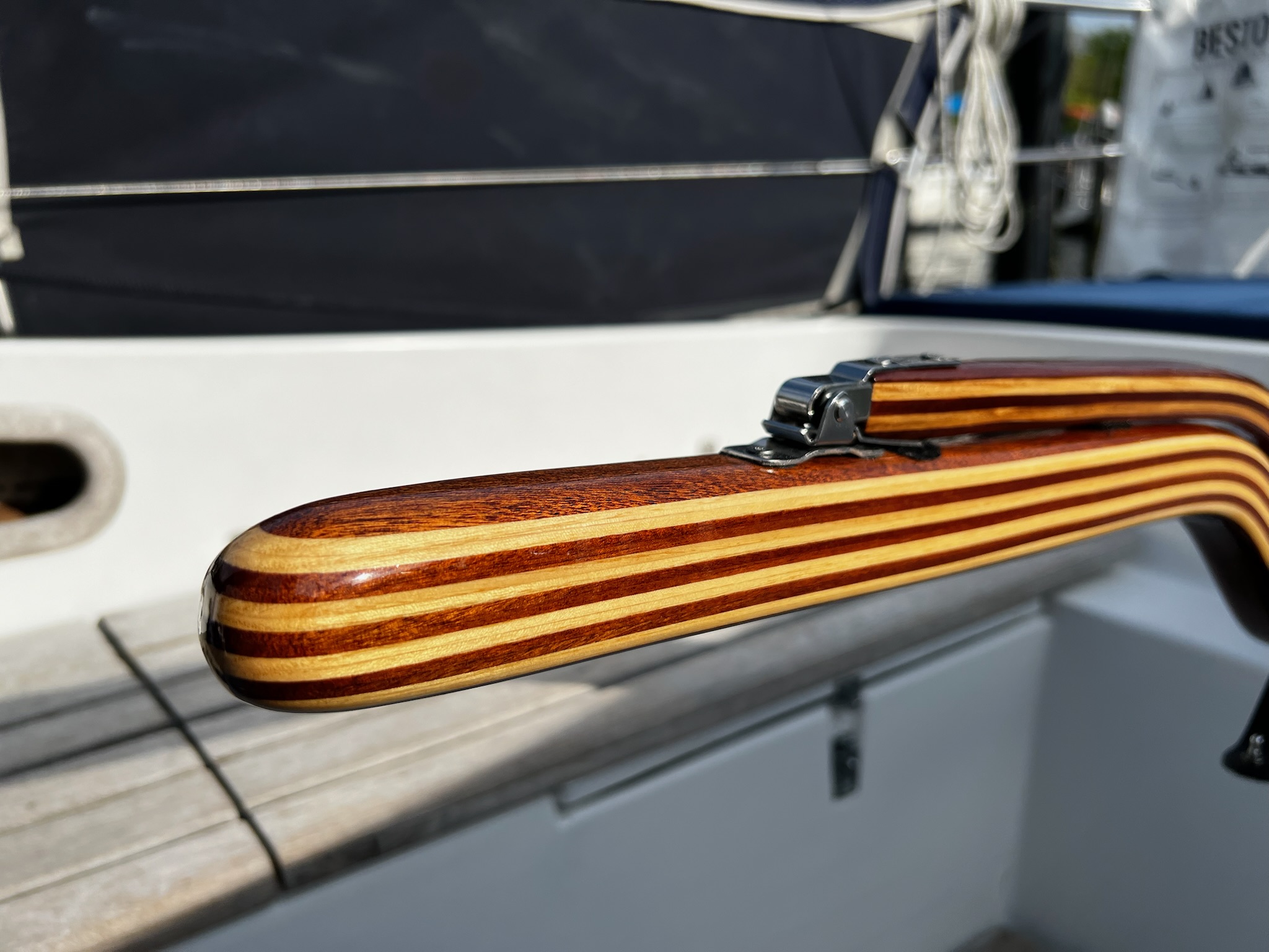 Pinne mit Pinnenausleger, der Reitbalken samt Traveller und die Tür zum Niedergang sind in den letzten zwei Jahren ersetzt worden. Pinne + Traveller kommen aus „Uli’s Pinnenparadies“ und sind von Hand aus Mahagoni und Esche laminiert und mit mehreren Schichten Epoxy und neun Schichten Lack beschichtet. War Arbeit. Die Pinne ist der Hammer.