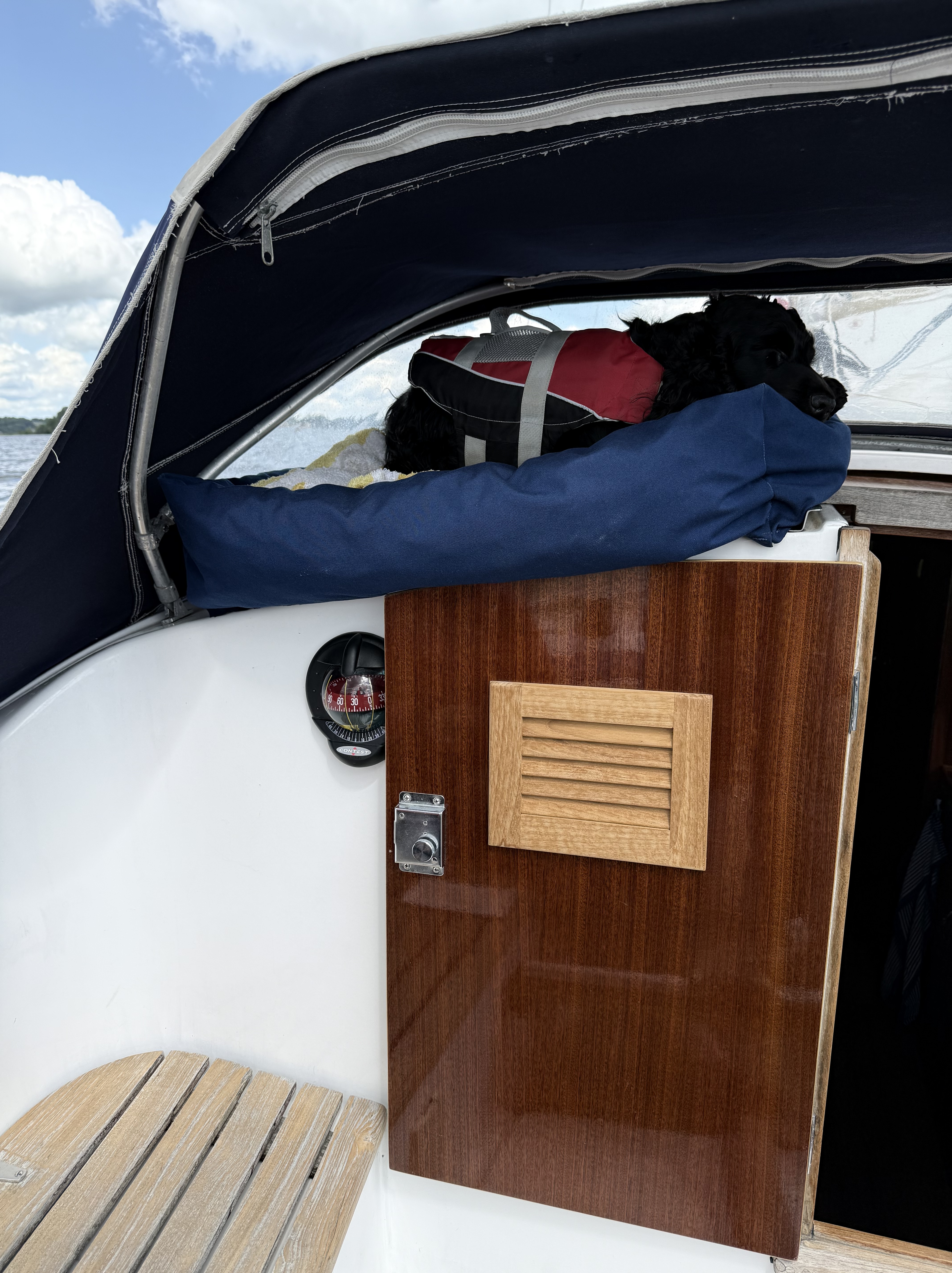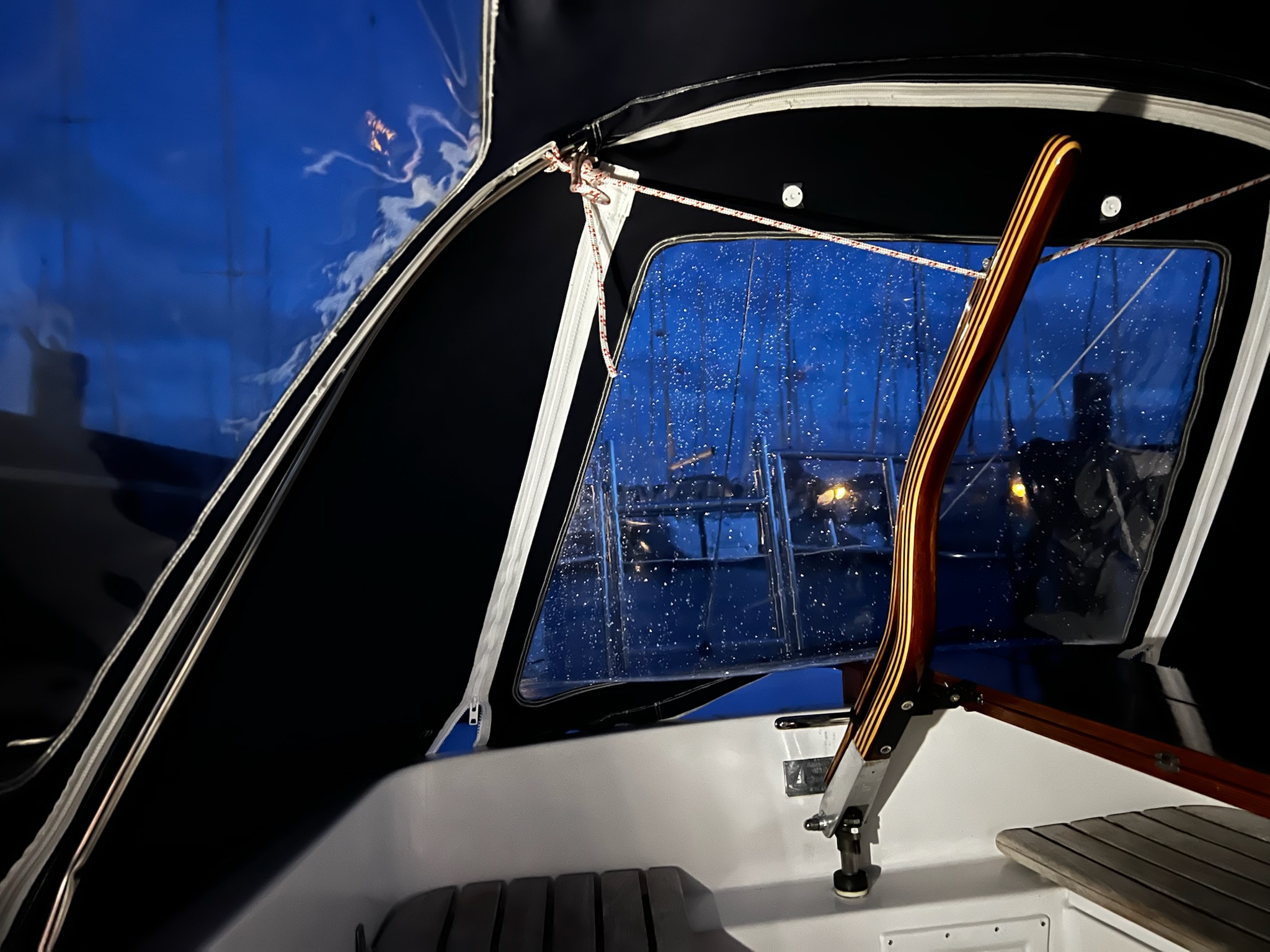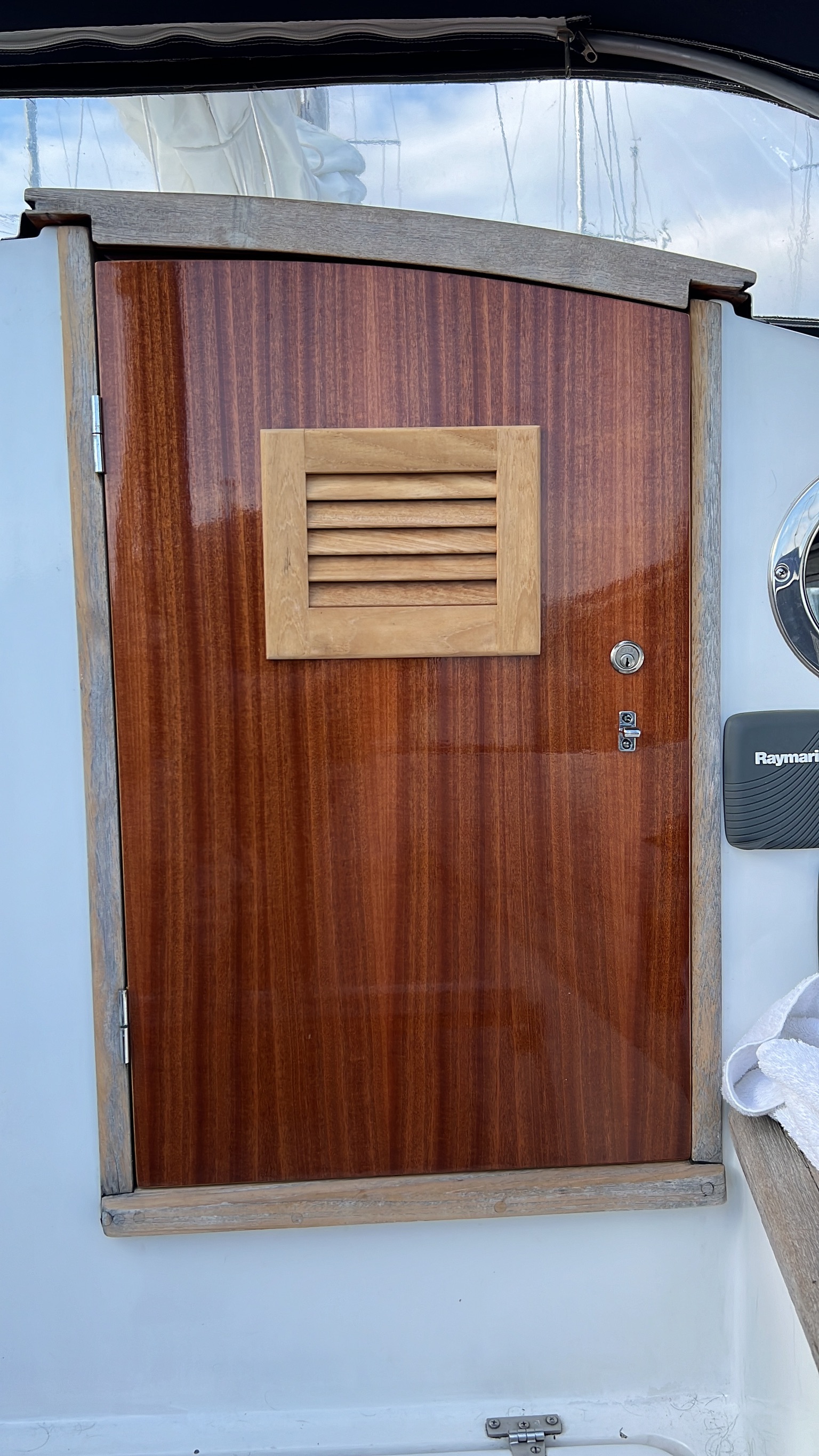 Pinne mit Pinnenausleger, der Reitbalken samt Traveller und die Tür zum Niedergang sind in den letzten zwei Jahren ersetzt worden. Pinne + Traveller kommen aus „Uli’s Pinnenparadies“ und sind von Hand aus Mahagoni und Esche laminiert und mit mehreren Schichten Epoxy und neun Schichten Lack beschichtet. War Arbeit. Die Pinne ist der Hammer.