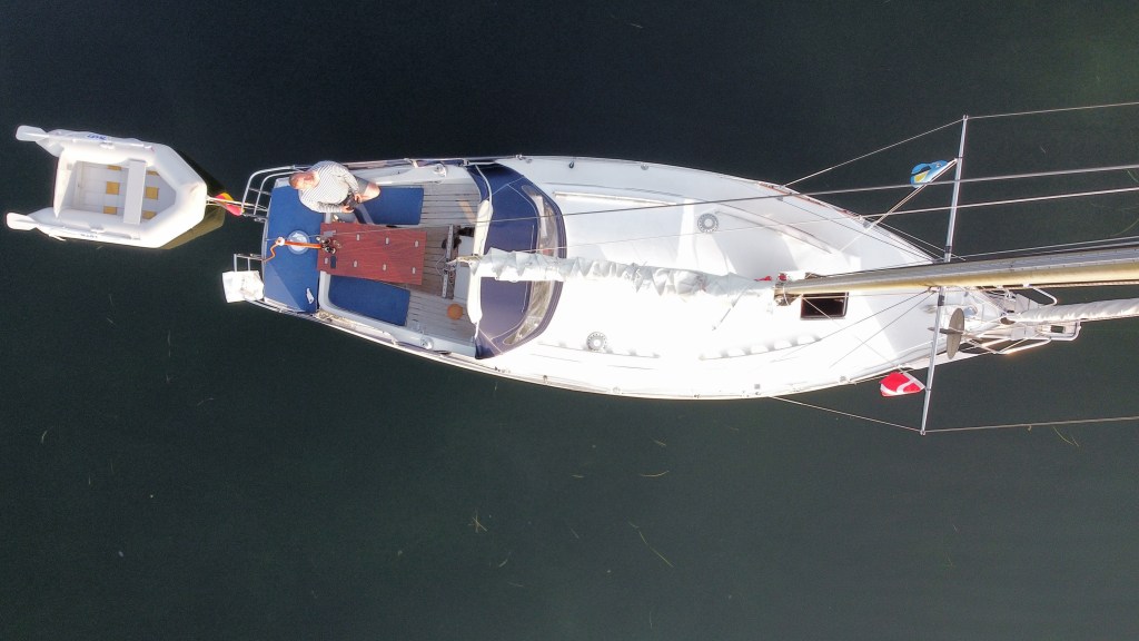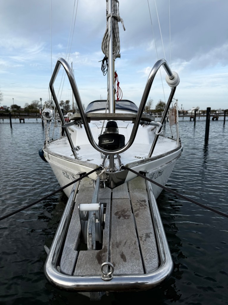 Achtern haben wir das Cockpit mit einem Polster um 2qm erweitert – unser Lieblingsplatz im Hafen und beim schönen Wetter durchaus auch beim segeln. Sehr kommod!