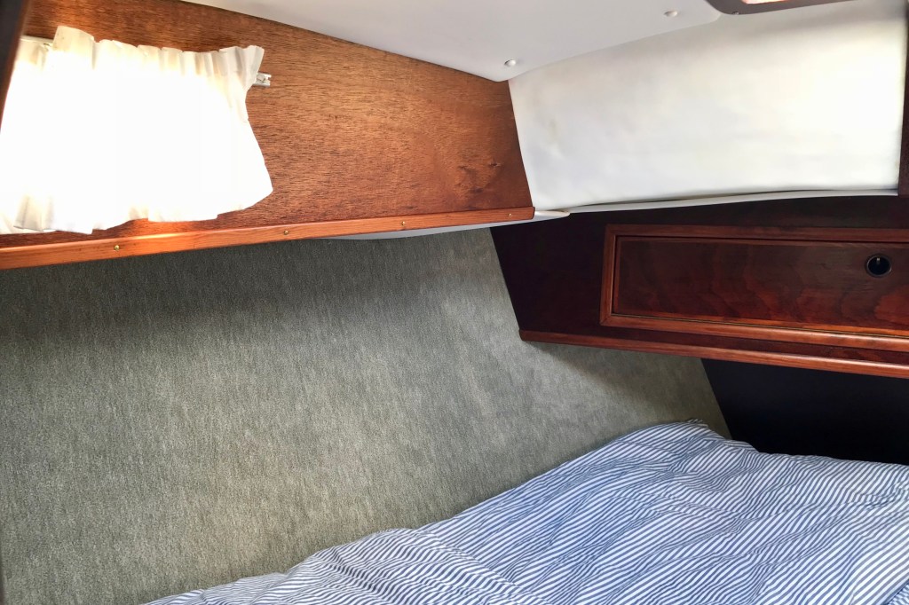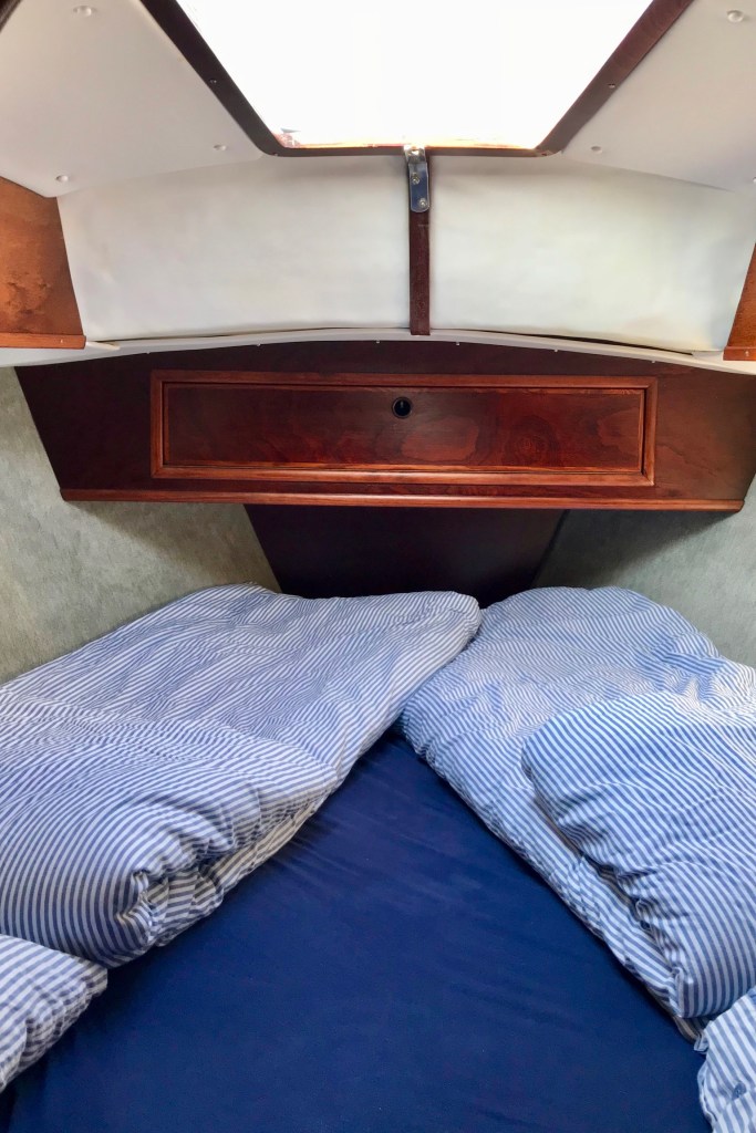 Das Vorschiff ist kuschelig und recht breit (am Kopfende), läuft aber schmal zu und ist vielleicht nicht optimal für Menschen über 1,85m.