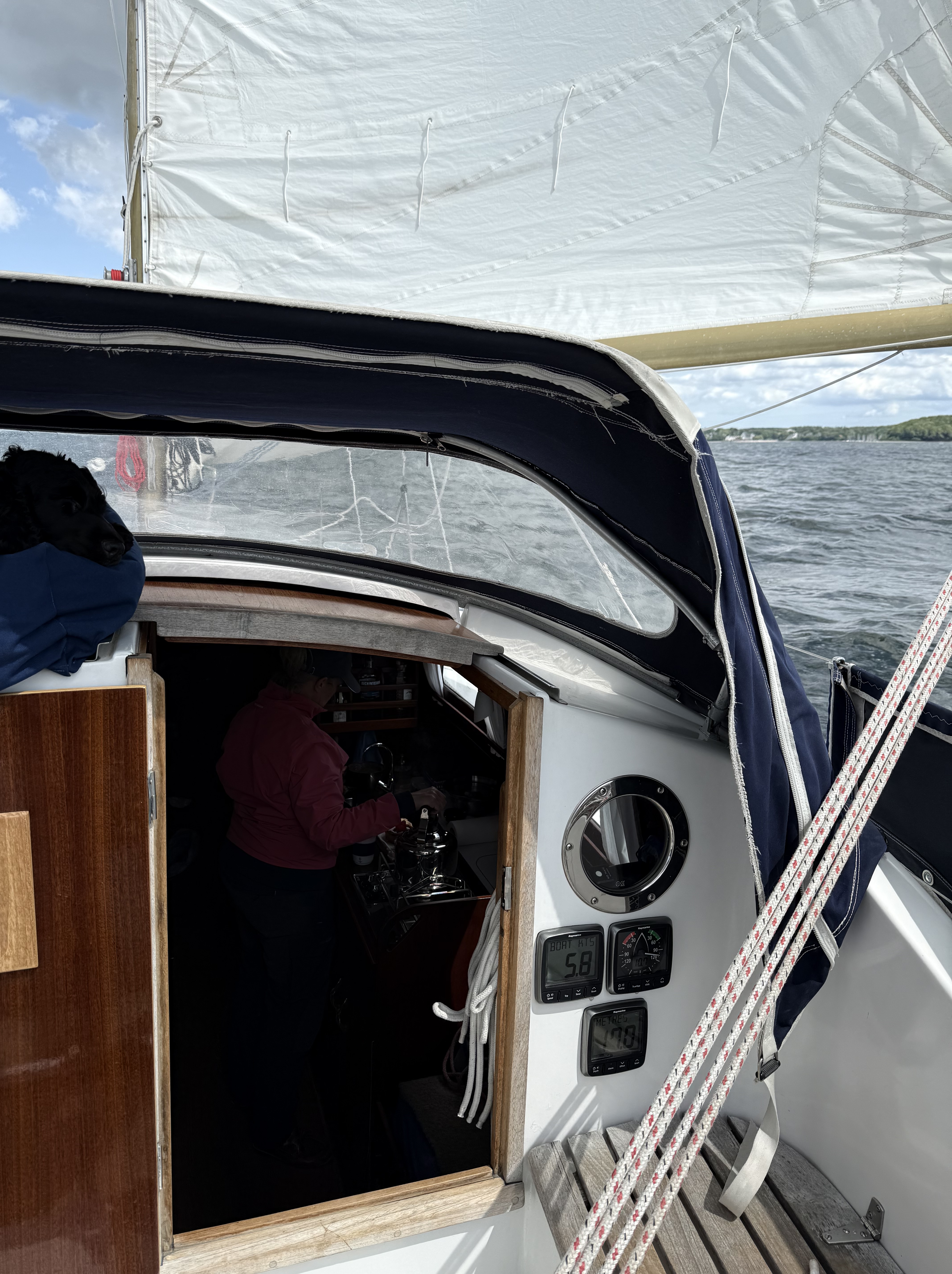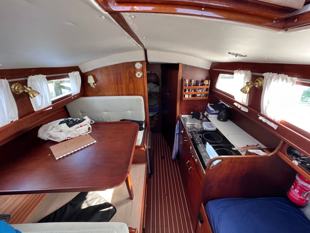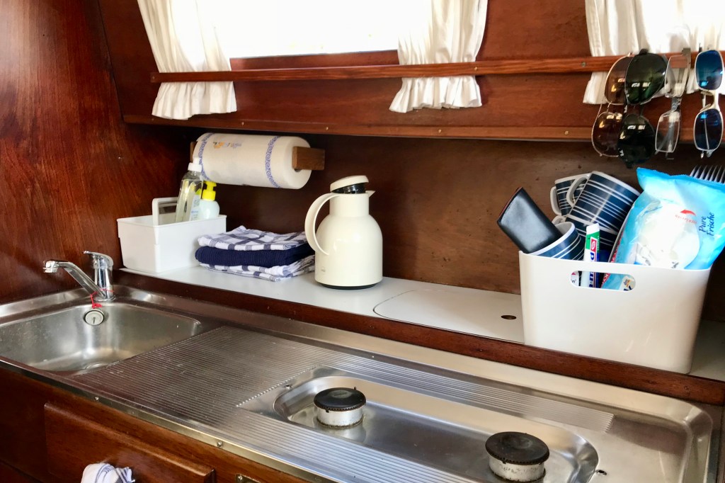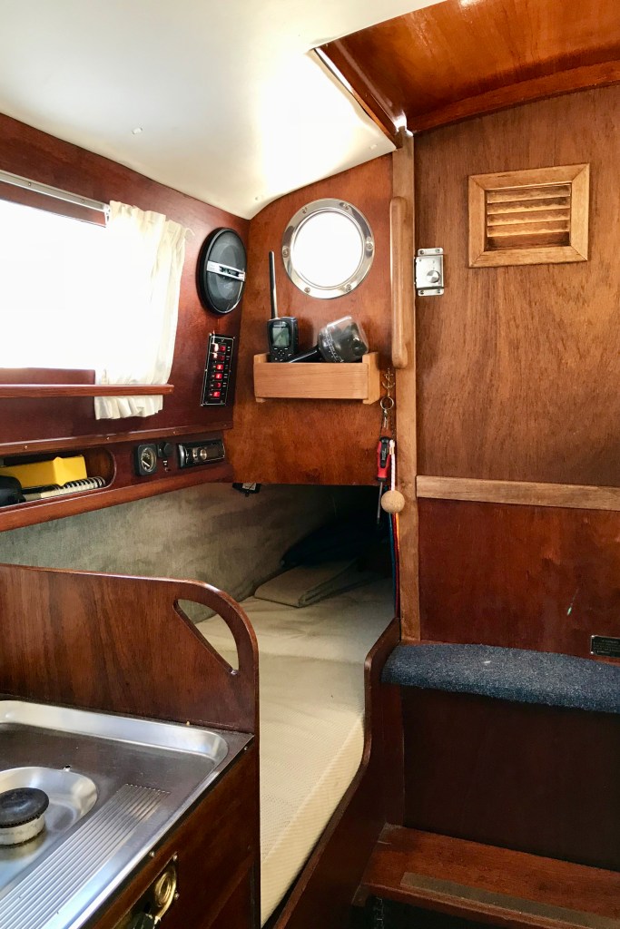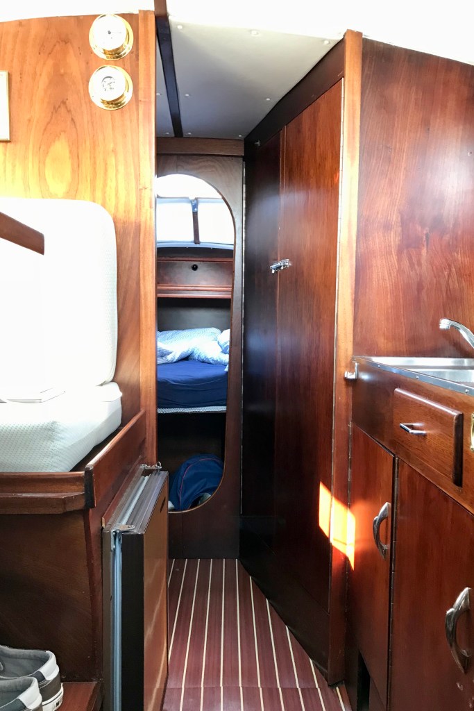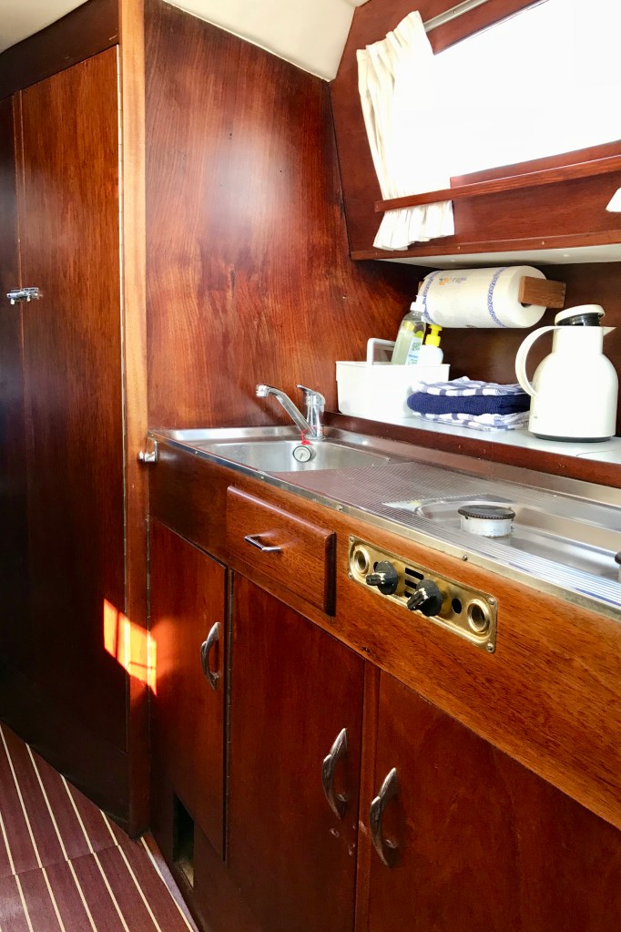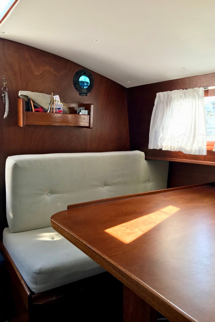 Anders als 90% oder mehr aller Boote ist die Fellowship mit einer Dinette gesegnet. Gesegnet? Ja. Für mich gibt es auf kleineren Fahrtenbooten kein besseres Raumkonzept. Auf der einen Seite auf einem kleinen Podest ein Tisch mit zwei Bänken, auf der anderen Seite die Pantry und sogar noch eine Hundekoje. Den Tisch kann man beim kochen mitbenutzen, was unter anderem dazu geführt hat, das bei uns auch mal ein schweineleckeres Saltimbocca a la Romana mit Risotto anstelle der früher eher üblichen Dosenravioli auf den Tisch kam. Sitzt man am Tisch, kann man aus dem Fenster schauen und das Hafenkino genießen. Schon dafür würde ich eine Dinette niemals gegen eine klassische Alternative tauschen.
