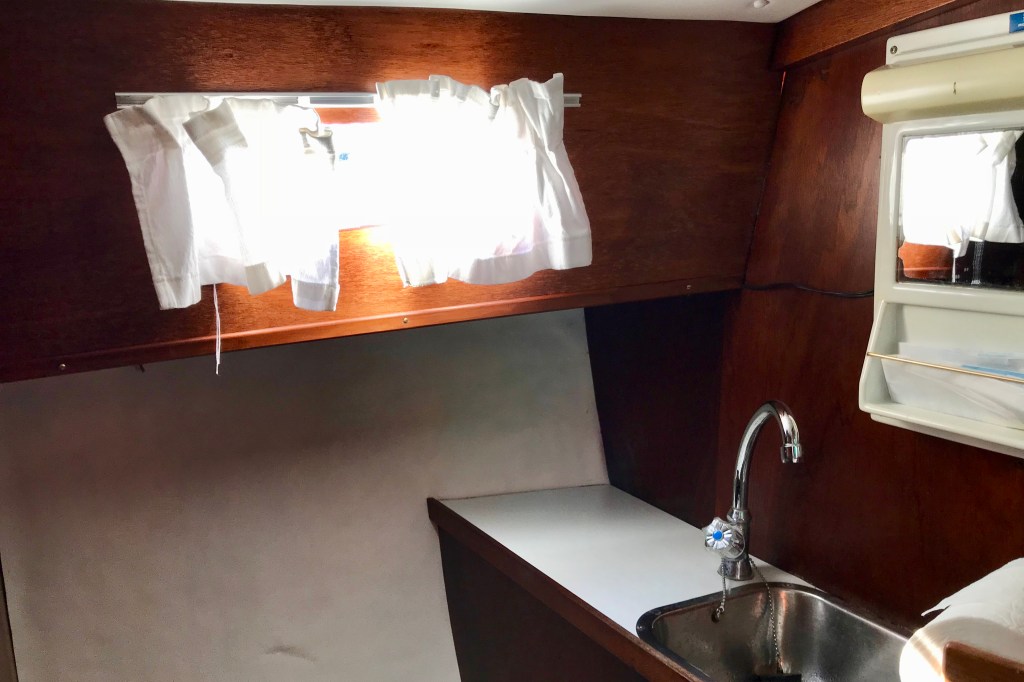 Die Toilette – nun sie existiert und kann benutzt werden. Komfortabel ist sie nicht, ich sage immer, dass ich sie mir eher anziehe, als dass ich sie betrete. Aufenthaltsqualität ist anders – aber hey, wer sitzt im Boot schon stundenlang auf dem Thron? Dafür gibt es aber einen Waschtisch mit Stauraum, einen Spiegel und alles, was das Herz (außer Platz) begehrt. Gegenüber vom Klo (Steuerbord, ohne Foto) ist ein komfortabler Schrank der großzügiger ist, als vieles was ich auf Großserien-Charterbooten teilweise vorgefunden habe. Reichlich Raum für mehrere Wochen Segeltörn mit zwei – drei Personen.