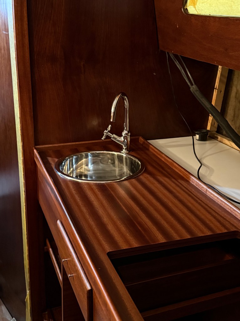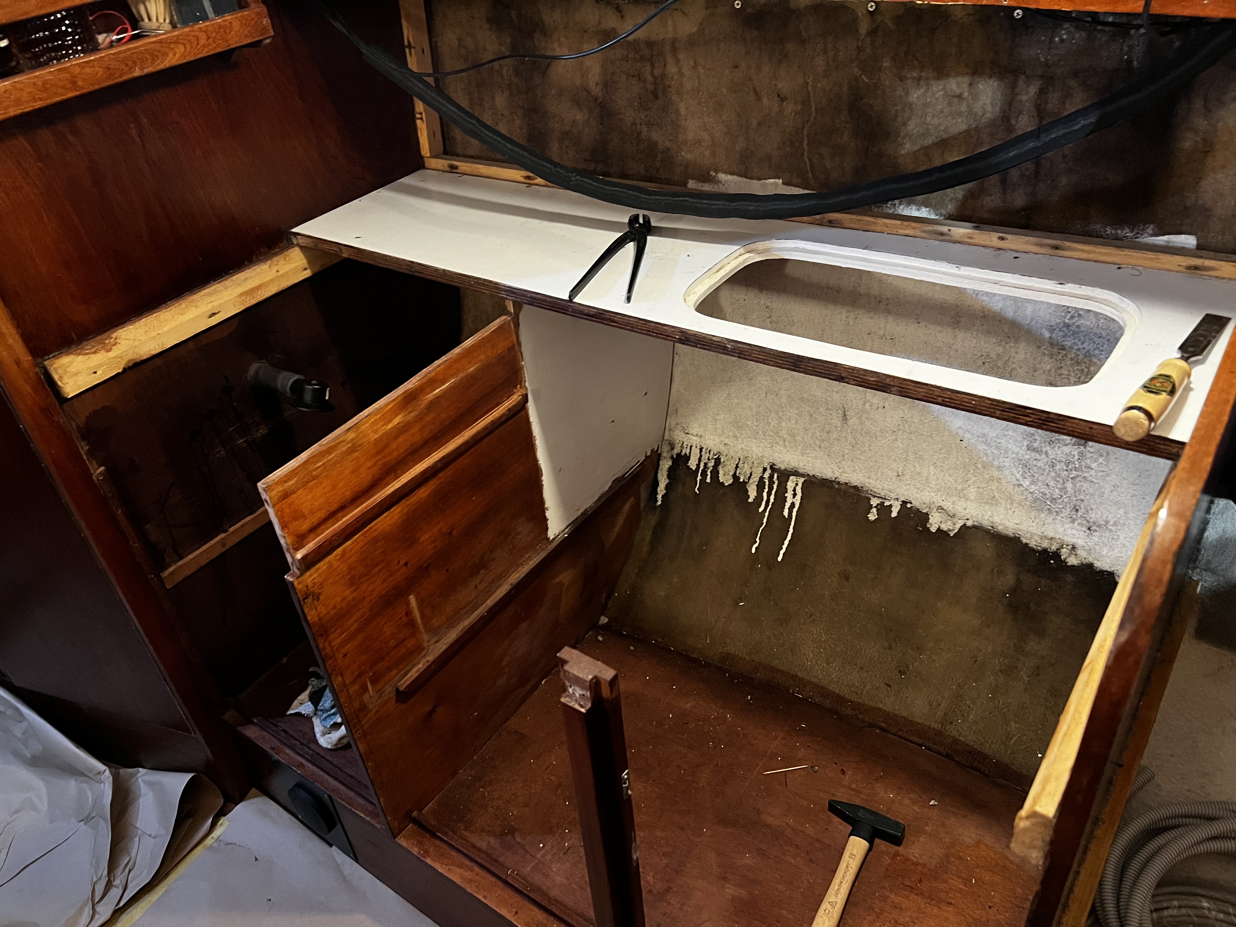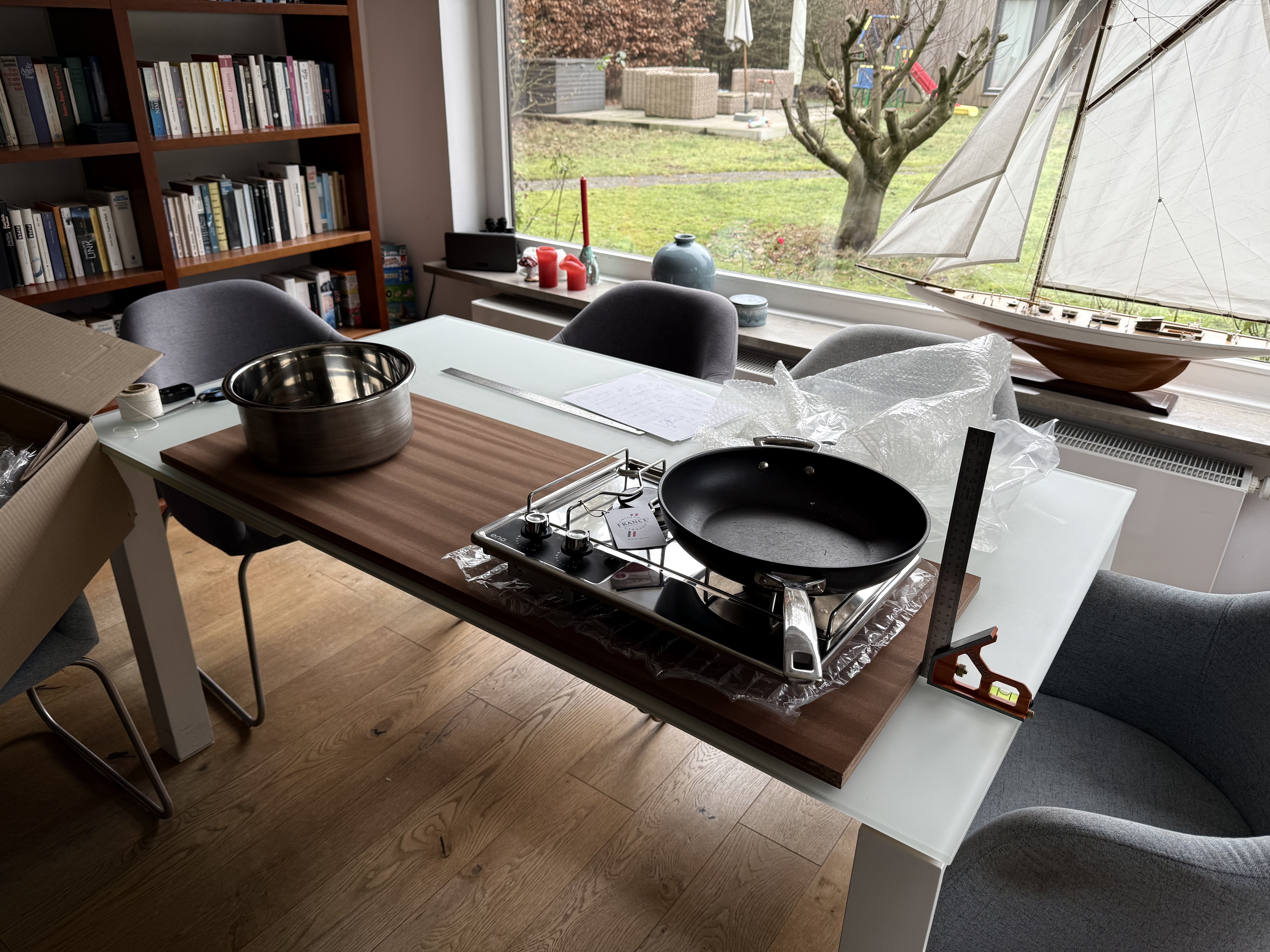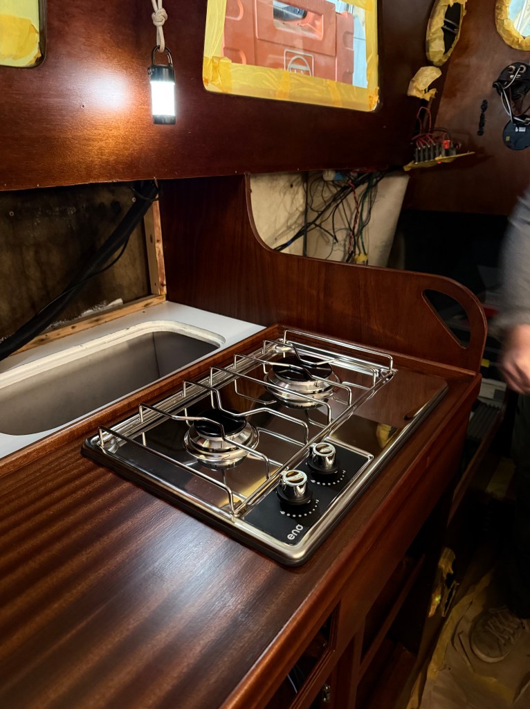 Der Gasherd war bereits bei der Übernahme 2014 nicht mehr einsatzbereit. Zehn Jahre lang behalfen wir uns mit einem Camping-Gaskocher für unterwegs und einer Elektroplatte im Hafen, die wir später durch eine Indunktionsplatte ersetzten. 2024 wollten wir wieder einen ‚ordentlichen‘ Herd haben und bauten bei der Gelegenheit die komplette Pantry neu: Socken und Seitenwand blieben stehen, den Rest haben wir komplett durch neues Marine-Bootsbausperrholz für den Außenbereich mit 1,3mm Furnierstärke von Sommerfeld & Thiele ersetzt. Das sollte jetzt wieder 50 Jahre lang halten.