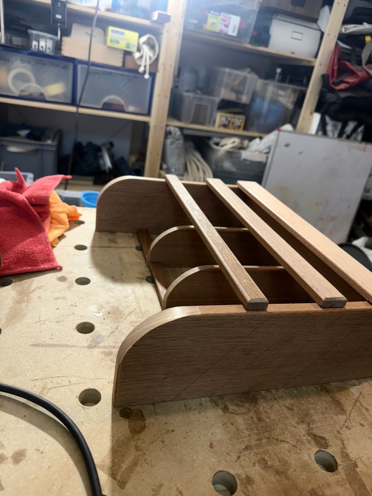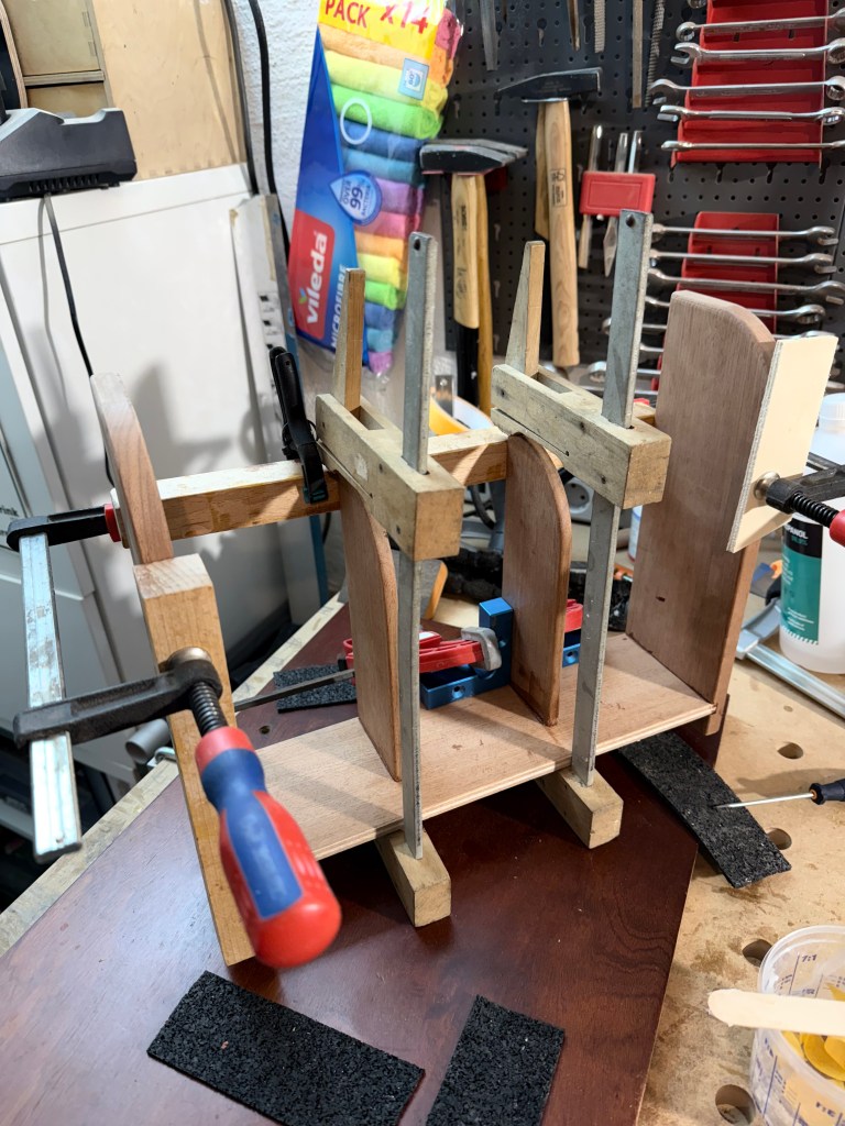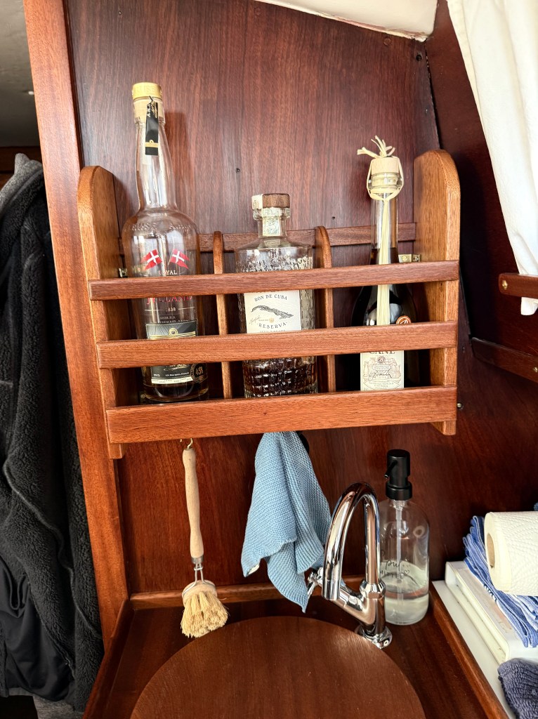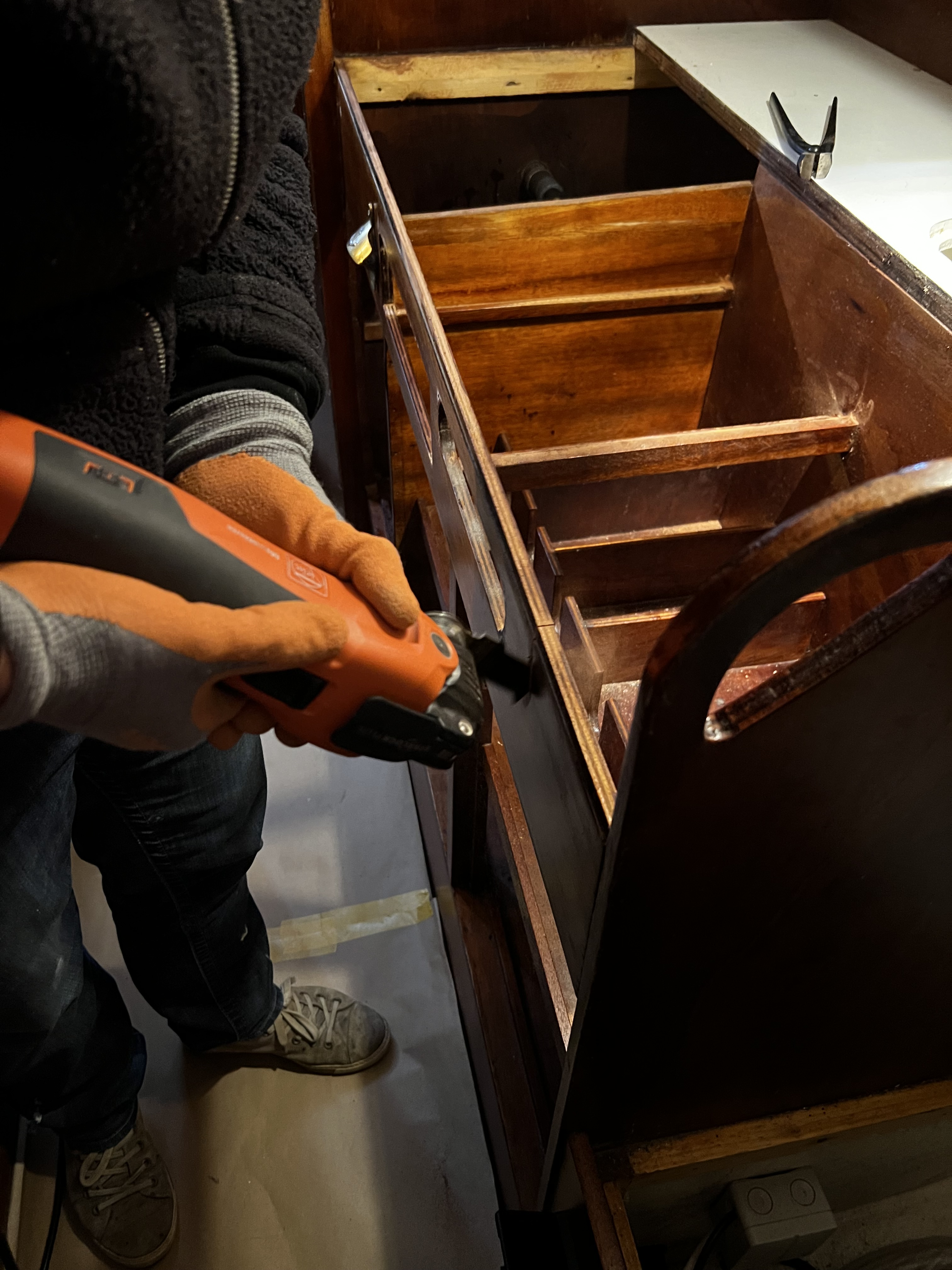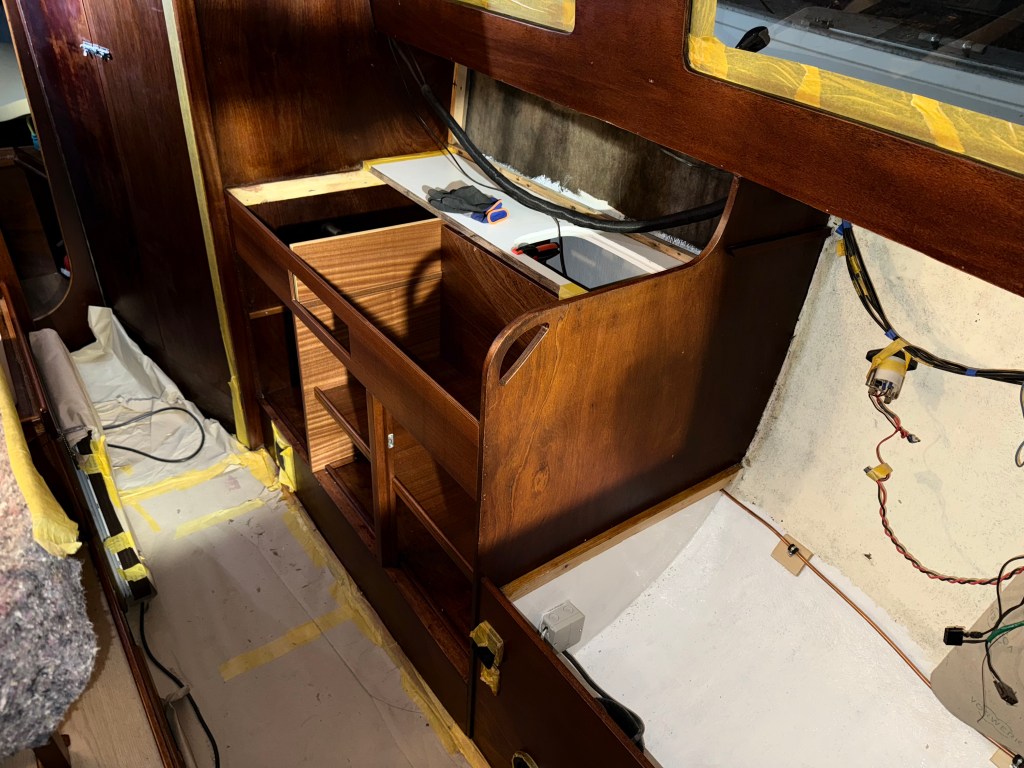 Der Gasherd war bereits bei der Übernahme 2014 nicht mehr einsatzbereit. Zehn Jahre lang behalfen wir uns mit einem Camping-Gaskocher für unterwegs und einer Elektroplatte im Hafen, die wir später durch eine Indunktionsplatte ersetzten. 2024 wollten wir wieder einen ‚ordentlichen‘ Herd haben und bauten bei der Gelegenheit die komplette Pantry neu: Socken und Seitenwand blieben stehen, den Rest haben wir komplett durch neues Marine-Bootsbausperrholz für den Außenbereich mit 1,3mm Furnierstärke von Sommerfeld & Thiele ersetzt. Das sollte jetzt wieder 50 Jahre lang halten.