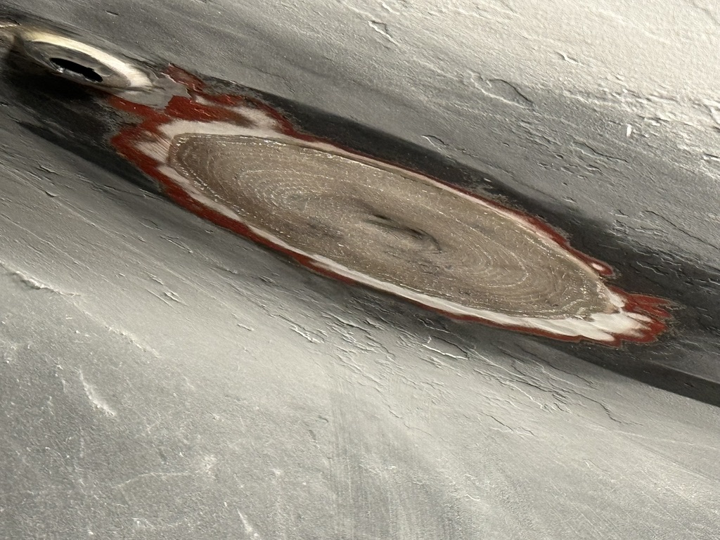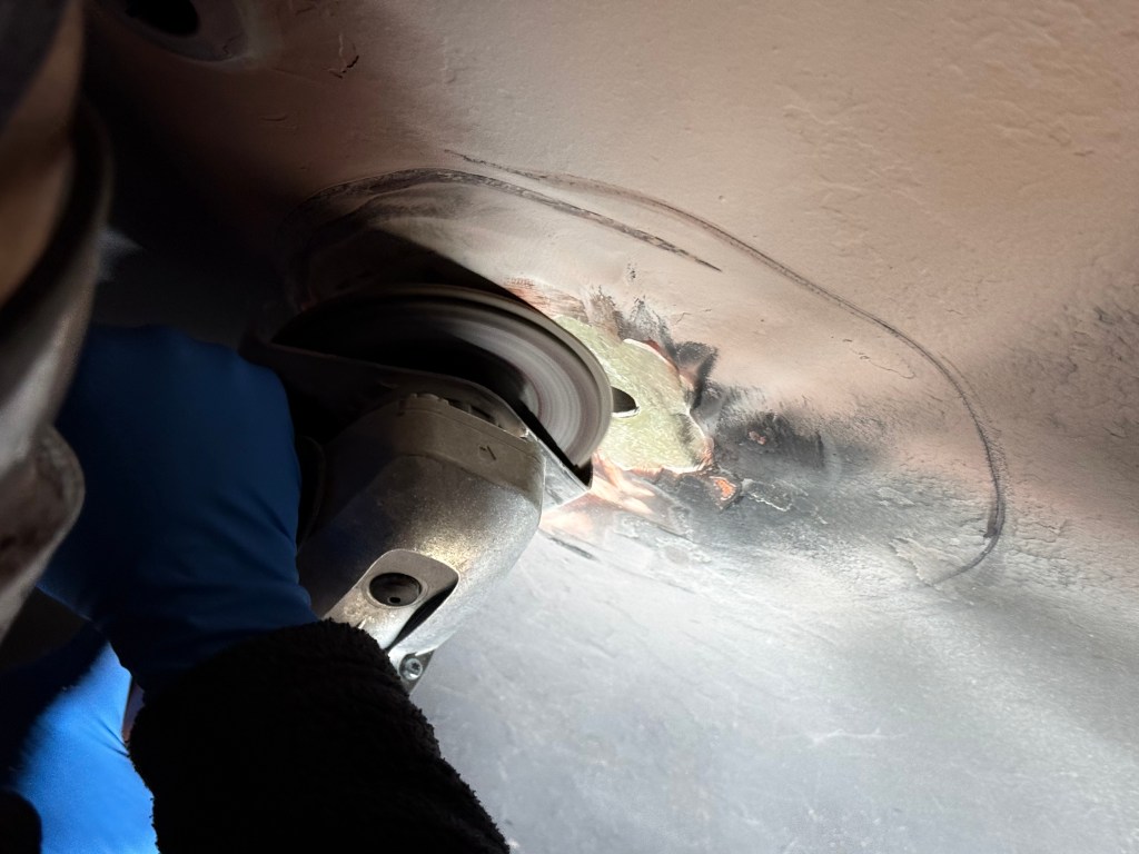Zum Verschließen der überflüssigen Öffnungen hat sich die Beste Bordfrau von Allen die Flex mit einer 80er Fächerscheibe genommen (Mit einem Exzenter wird es „ein wenig“ länger dauern), und großzügig kegelförmig angeschäftet.