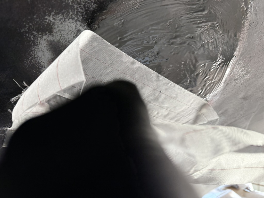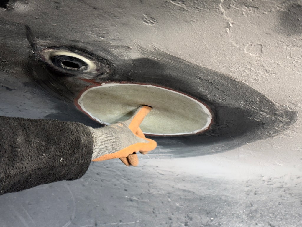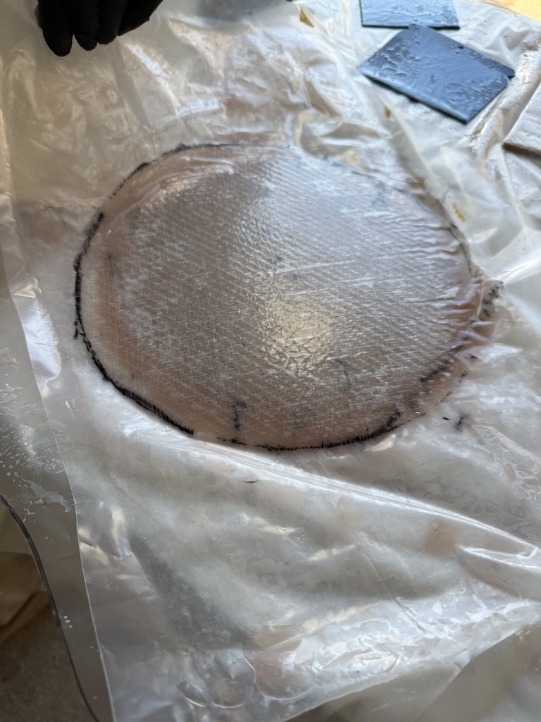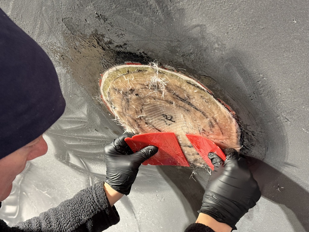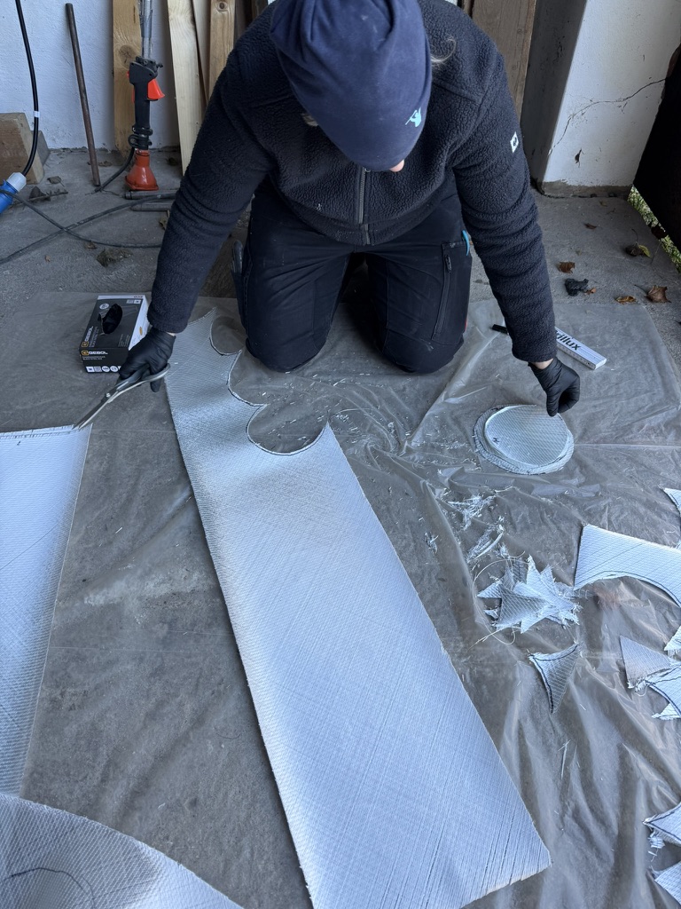 Verschlossen wird das Ganze dann mit einigen passend zugeschnittenen Glasfasergelegen. Für den Zuschnitt haben wir uns eine spezielle, für Glasfaser geeignete Schere ausgeliehen. Mit einer handelsüblichen Schere geht es auch irgendwie – aber die kann man hinterher wegwerfen.
