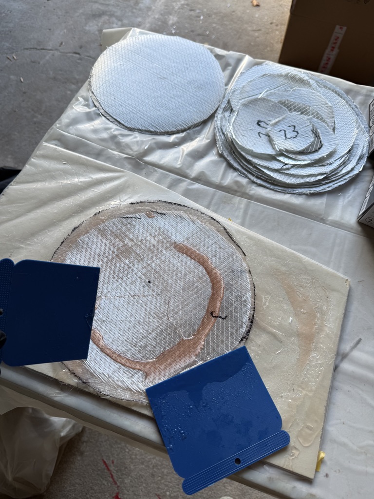 Wir haben ein mittelschweres Bidiagonalgelege verwendet, etwa 280g/qm. Die Anzahl der benötigten Lagen ergibt sich aus dem Datenblatt und dürfte bei etwa drei Lagen pro Millimeter liegen. Hier sollte man nicht sparen… Alles was man zu wenig hat, muss man hinterher spachteln – alles was zuviel ist, wird weggeschliffen.