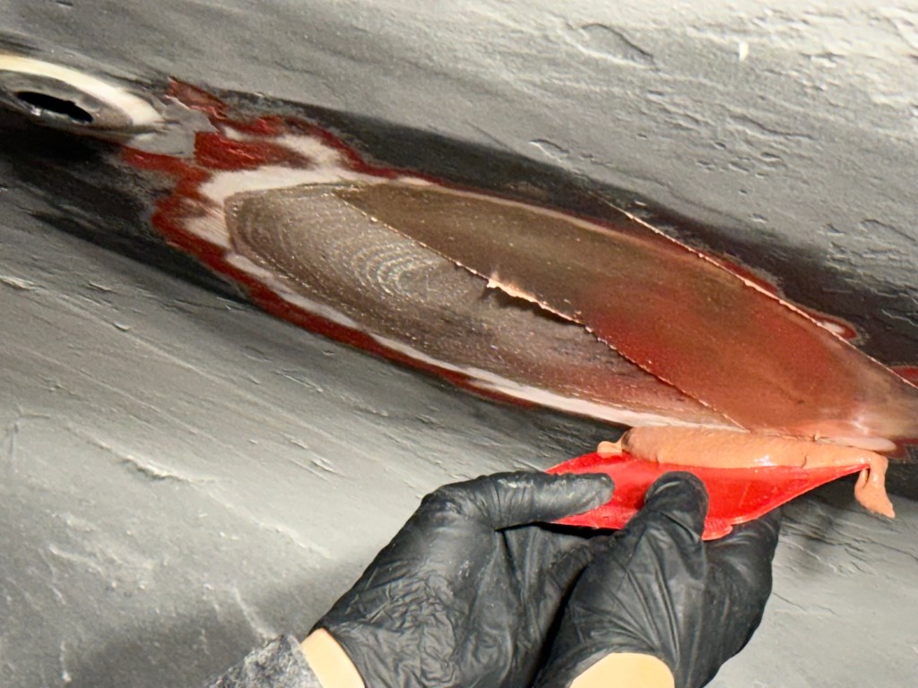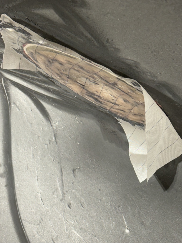 Auch zum aufbringen des Paketes sind Brett und Spachtel hilfreich. Das Epoxy ist zäh genug, dass der ganze Gammel anschließend nicht nach unten läuft. Abreißgewebe drauf und aushärten lassen…