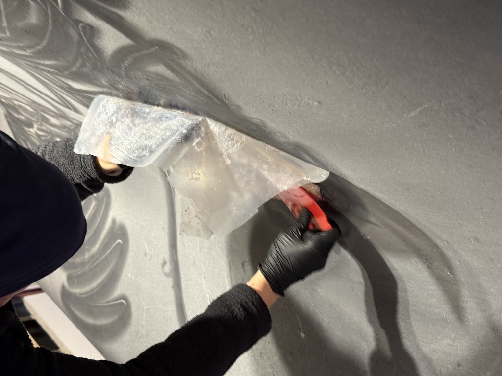 Zum laminieren haben wir uns ein Brett mit Plastikfolie überzogen. Darauf haftet das Epoxy nicht. Plastik ist überhaupt das Schlüsselwort: Beim Laminieren stellt man sich am besten direkt eine Packung Einmalhandschuhe parat und wechselt die Handschuhe ständig, um nicht alles, was man anfasst einzusauen.