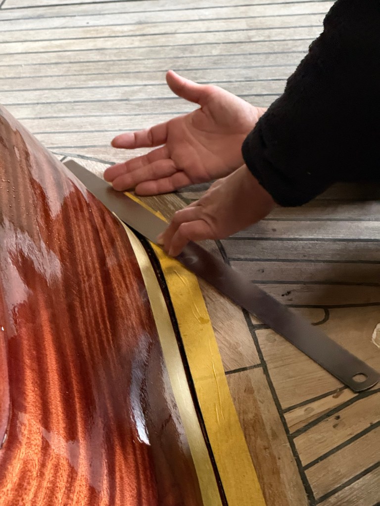 Anders als auf dem Deck, können wir die Fuge hier nicht in Form schleifen. Wir kleben also ab. Mit einem dünnen Metall-Lineal findet man eine schöne, strakende Linie um das obere Abklebeband auf einen definierten Abstand zum Deck zu bekommen.