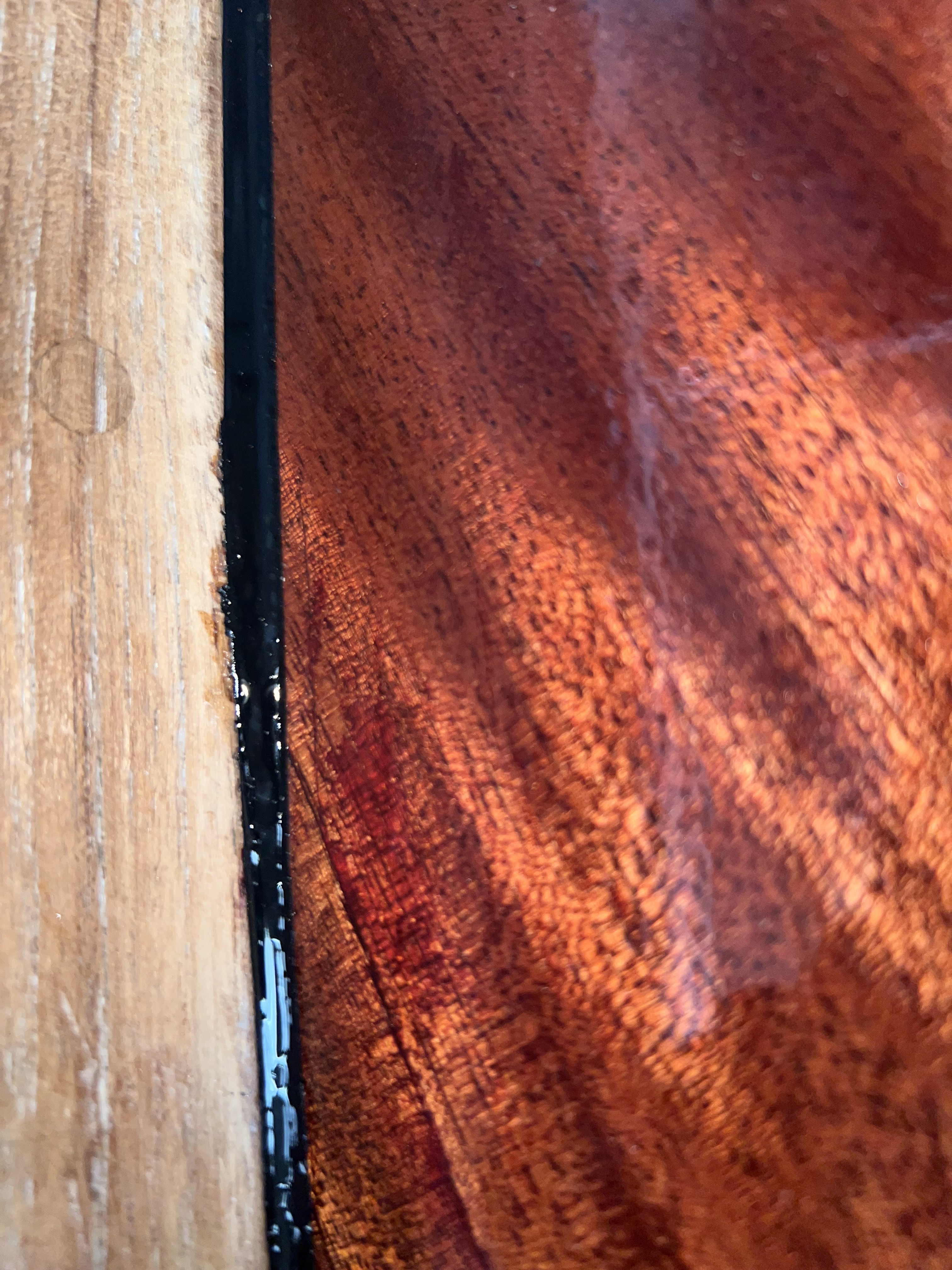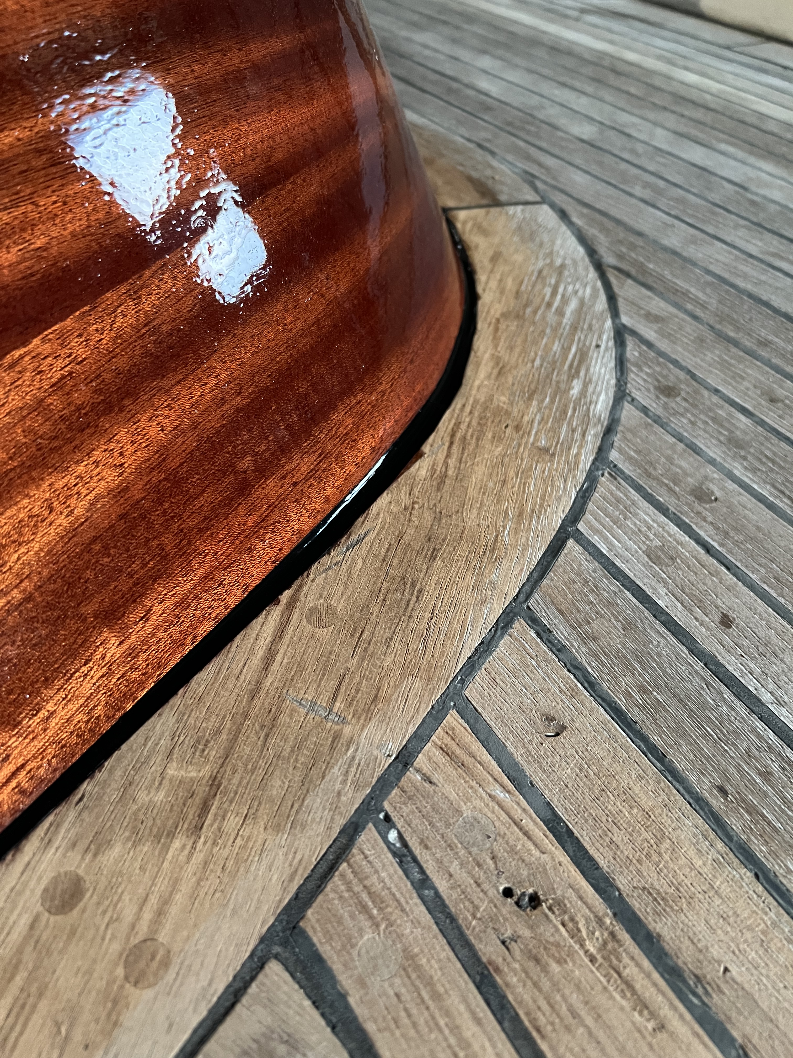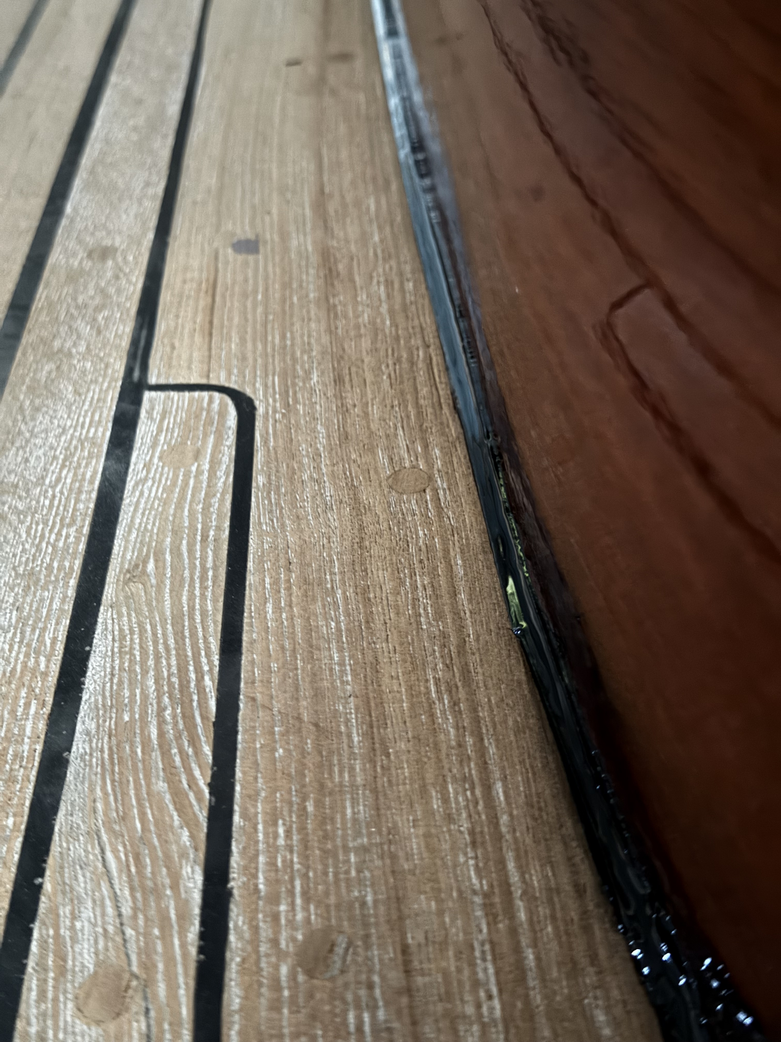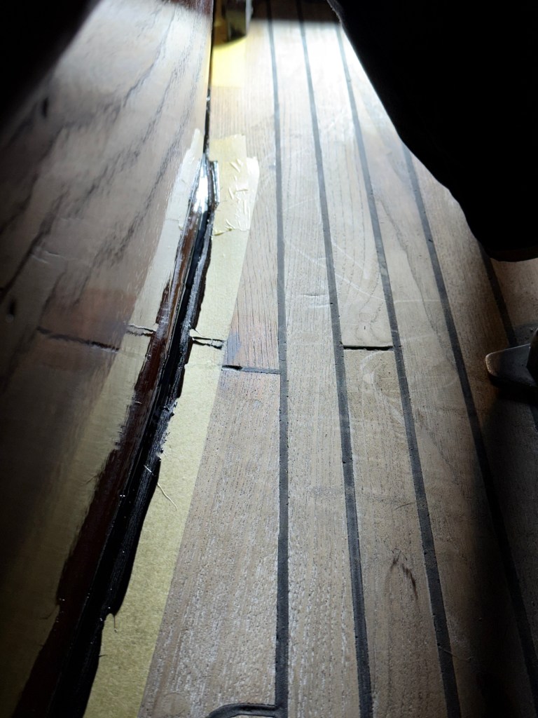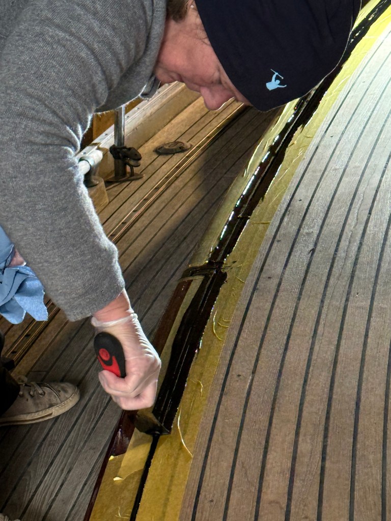 Man könnte meinen, dass jeder, der ein Teakdeck hat, weiß wie das geht: Fugenband, bei Bedarf Primern, Fugenmasse einpressen, abschleifen. Der kleine Unterschied ist eigentlich nur, dass wir zwischen frisch lackiertem Mahagoni und Teak nicht schleifen können…
