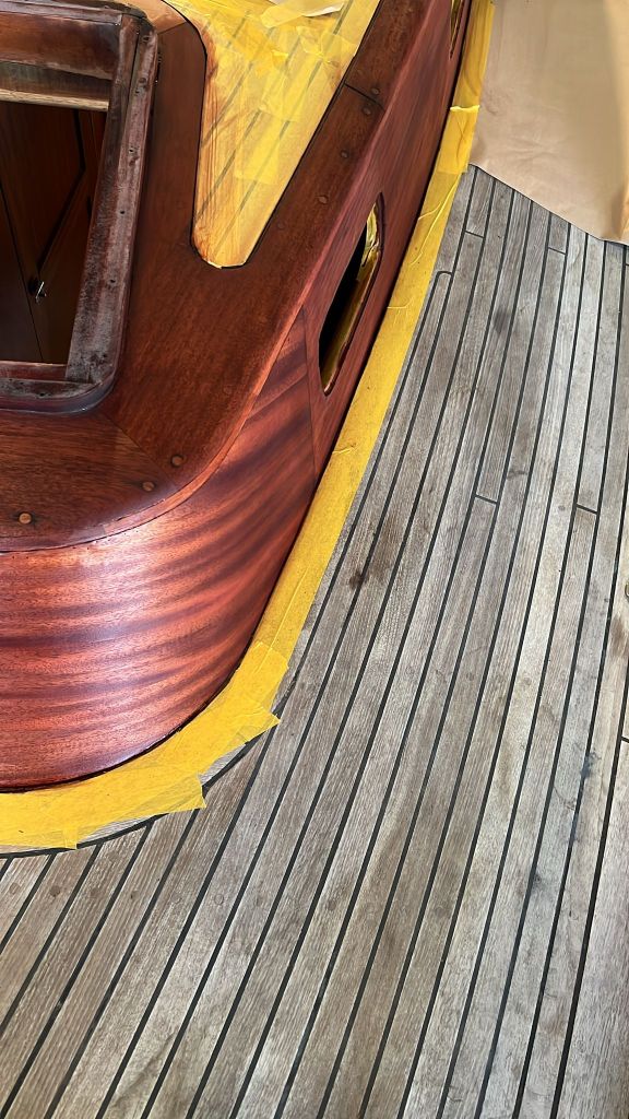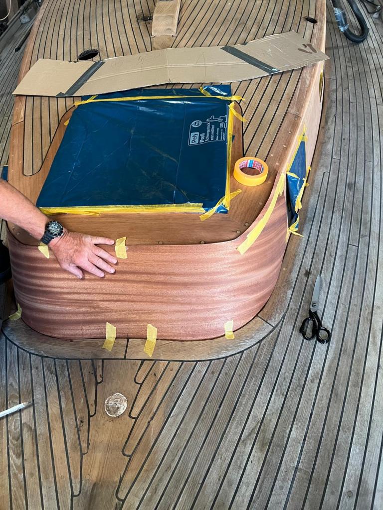 Alles sauber abkleben – und endlich kann gebeizt werden. Eine Schicht International Interstain reichte uns, zwei wären möglicherweise zu krass ins rot-geschminkte gegangen – aber das ist natürlich Geschmacksache. Die Beize hat einen deutlichen Rotton, anders als die von Epifanes, die eher braun ist und für ein kühleres Ergebnis sorgt. So extrem wie hier ist es nach zwei Tagen Auslüften aber nicht mehr.