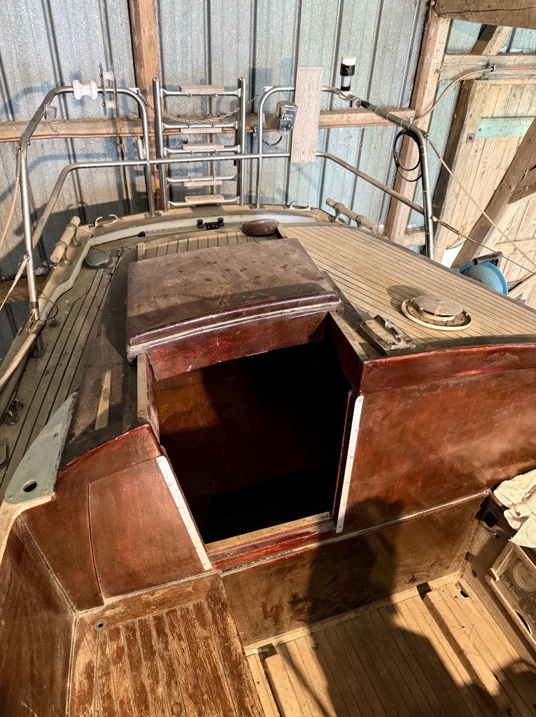 Der im Anschluss aufgetragene Lack erinnerte bei Kauf des Bootes eher an braune Baumarkt-Tünche, als an einen Klarlack: Die Aufbauten waren dunkelbraun, fleckig, scheckig, unansehnlich.