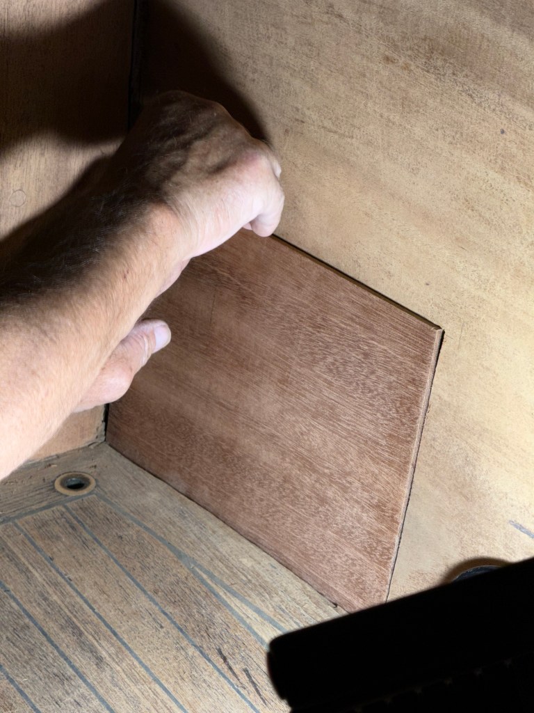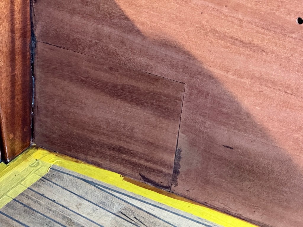 An Backbord ist das Süll ebenfalls rott. Wir schneiden ein Stück mit dem Multimaster heraus (von beiden Seiten – hier nur die Innenseite), passen ein neues Stück an und kleben es mit PU Leim ein. Der PU Leim quillt anders als Weißleim oder Epoxy auf und sorgt so für eine gute Haftung. Mit einem Brett verkeilen wir den Flicken.