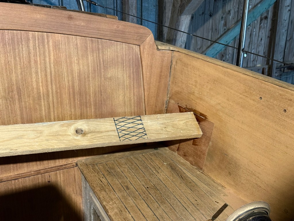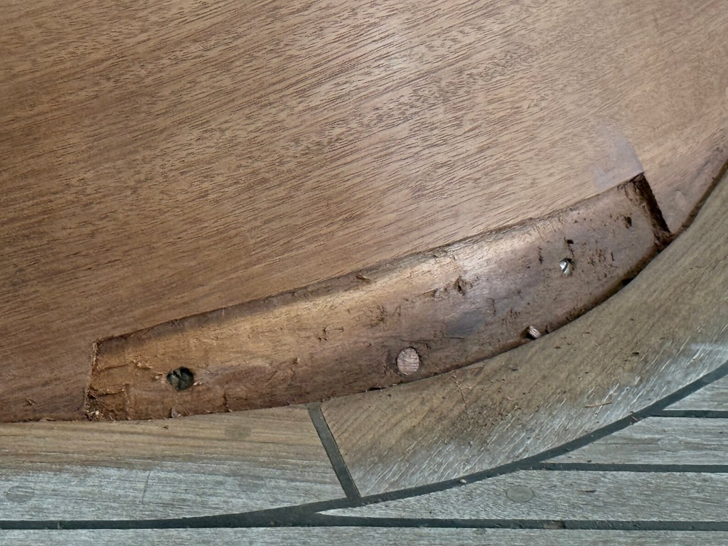 Das hier war mal der Reitbalken für den Traveller im Cockpit. Eingebaut sah er noch fast ok aus, aber spätestens beim ziehen der Schrauben wurde klar, dass das Holz rott ist. Eine kräftige Böe, dann hätte man Freude gehabt…