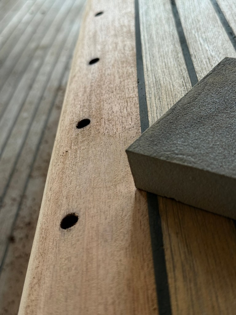 Einige Proppen haben deutliche schwarze Ränder. Nach vorsichtigem Klopfen sehen wir, dass manche davon ersetzt werden müssen (Proppen mit einem kleinen Schraubenzieher vorsichtig herausstechen, Schrauben ziehen, tiefer bohren, neue Schraube einsetzen, Proppen einem Tropfen PU Leim wieder einsetzen).
