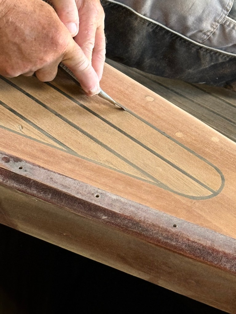 Die Fugen zwischen Teak und Mahagoni müssen alle entfernt werden, sowohl oben als auch unten am Aufbau. Mit einem Cutter, Fugenkratzer und Schleifpapier geht das gut und ist in vielleicht zwei Stunden erledigt.
